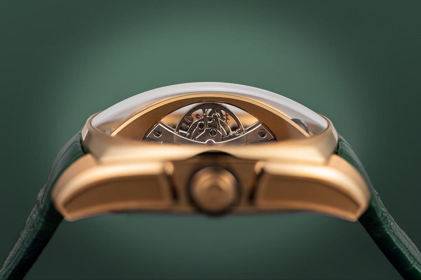 Malachite, with its vibrant green hues and naturally variegated veins, defines the watch’s visual and emotional appeal. The gemstone adorns the retrograde hour and minute arches, framed in golden accents that mirror the warmth of the rose gold case. This choice of material lends a textured brilliance and evokes rarity and opulence. Historically, malachite has been prized across cultures for its protective and transformative properties. Often used in ancient amulets and royal adornments, This cultural significance imbues the Klepcys with an additional layer of mystique that transcends conventional design.