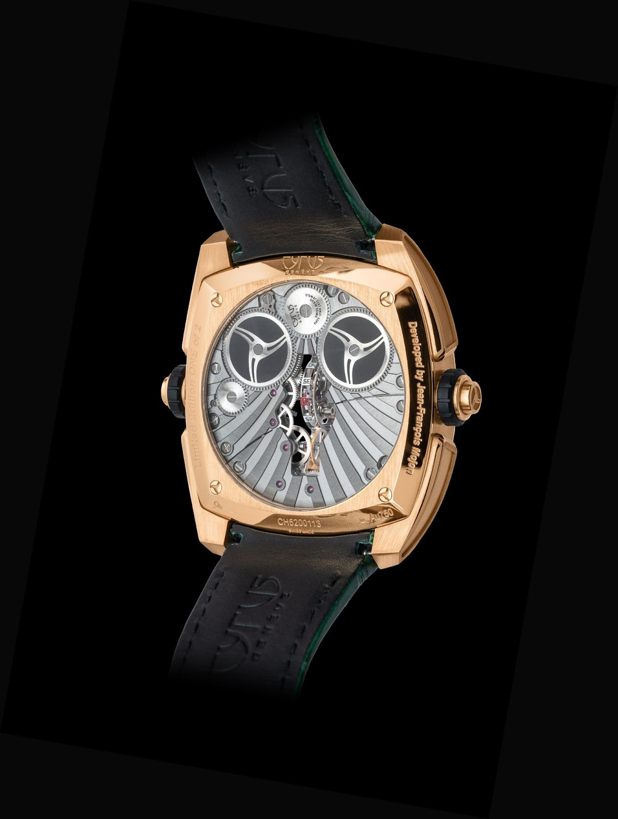 Every component of the in-house calibre CYR625 movement is a canvas for artisanal finishing. From the dark grey NAC-treated bridges adorned with sunray patterns to the mirror-polished cams and rhodium-plated wheels with cerclage decoration, the watch’s interior is as captivating as its exterior. Even the reverse side of the movement, visible through the sapphire case back, reveals a meticulous interplay of textures and finishes, including the signature propeller-like logos on the barrels’ lacquered ratchet wheels.