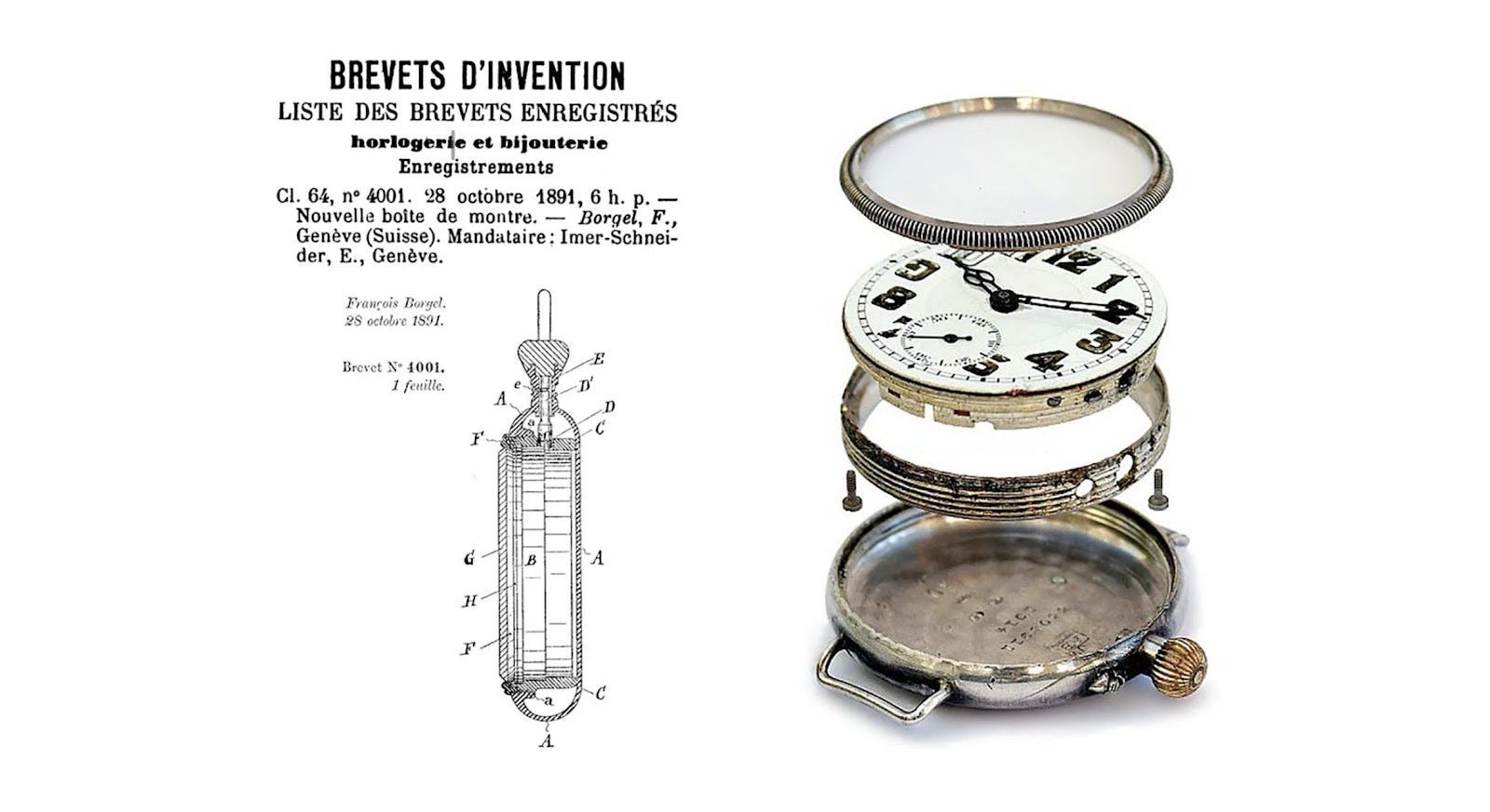 In Switzerland in 1891, the watch case manufacturer Borgel of Geneva filed a patent for a one-piece waterproof case, where the movement was screwed into the case through the front and then sealed with a tightly fitting bezel and glass (Fig. 1). A 1914 trade magazine advertisement shows that Borgel‘s waterproof cases were already compatible for both pocket watches and wristwatches. Borgel supplied its waterproof cases to brands such as IWC and Longines during World War I, as well as to Rolex in the 1920s.