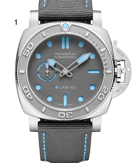 The Panerai Submersible eLAB-ID features a case, caseback, and bezel made from EcoTitanium™, composed of recycled titanium. The movement includes recycled materials, and the luminescent material on the hands and markers is made from recycled Super-LumiNova™.