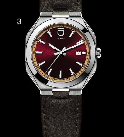 The ID Genève Circular 1 Grenat Edition puts emphasis on circular economy principles, modular design, and the use of recycled materials. It features a case made from 100% recycled stainless steel and recycled movement components.