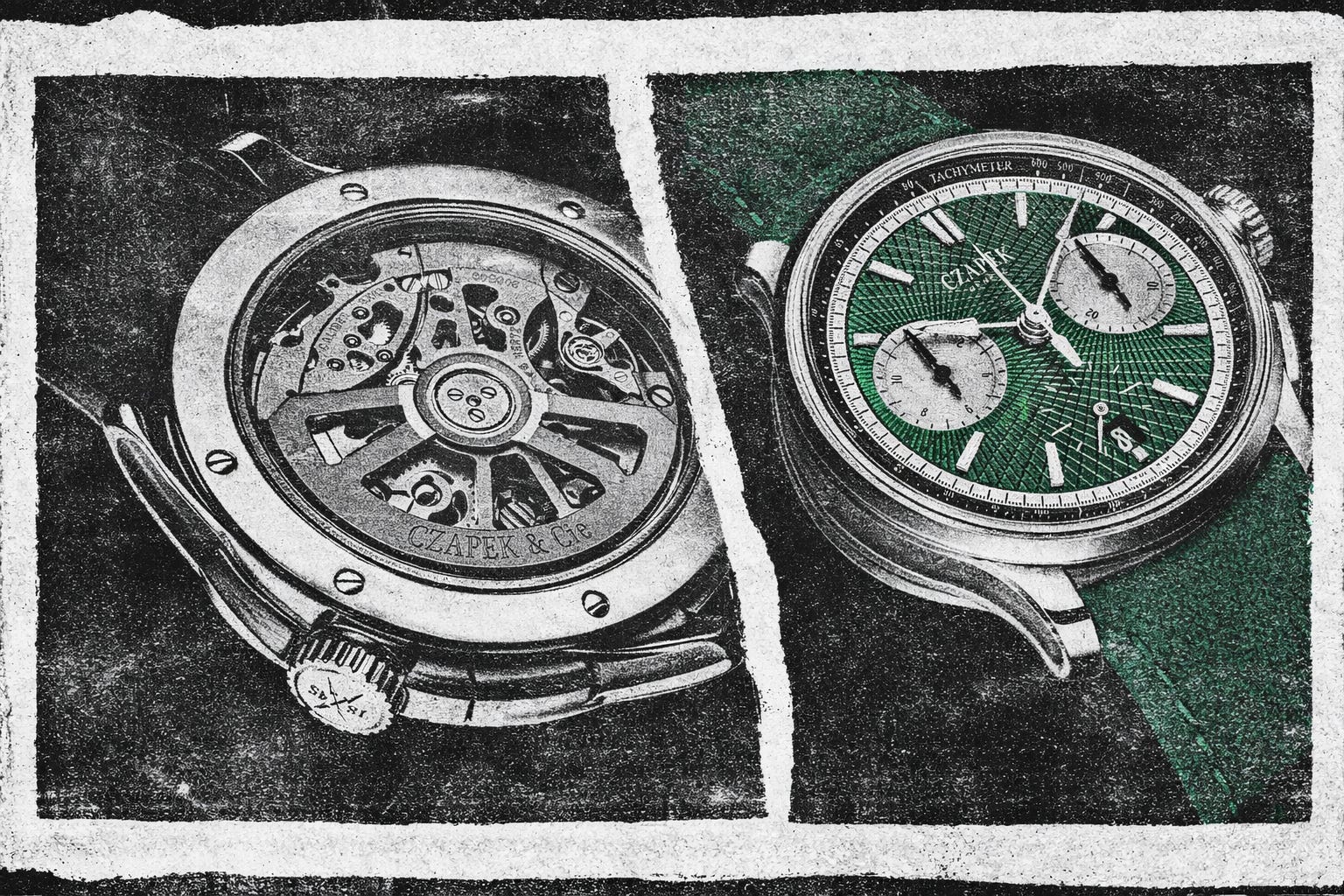 English green conquest. Tire-tread guilloché etched deep, tachymeter haunts periphery from aviation’s dawn. SXH3 vertical clutch chronograph beats 36,000 vph—smooth start, permanent run permitted. Vaucher-built, column wheel, COSC papers. Crossroads philosophy: marathon to evening. Steel at 41.5mm. Metalem dial sorcery.