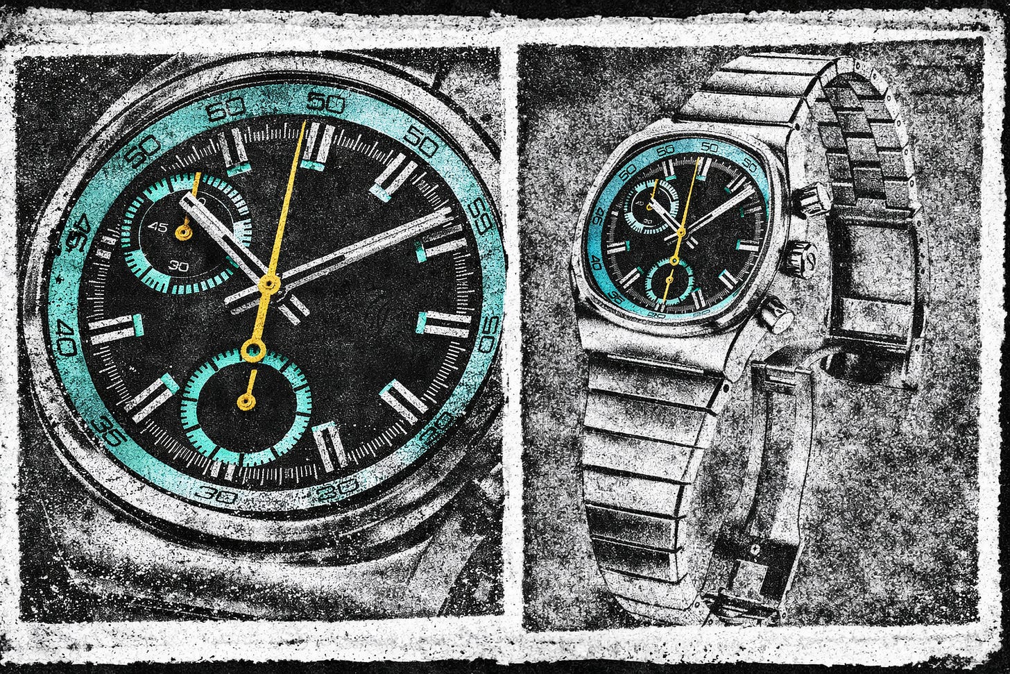 Seventies espresso timer. Built for 25-35 second shot extraction, sixty-minute cumulative tracking. Teal recessed subdials against black. Industrial brushed steel, polished accents. Hybrid meca-quartz VK68—mechanical pushers, quartz precision. 36mm compact. Utilitarian dress chronograph.