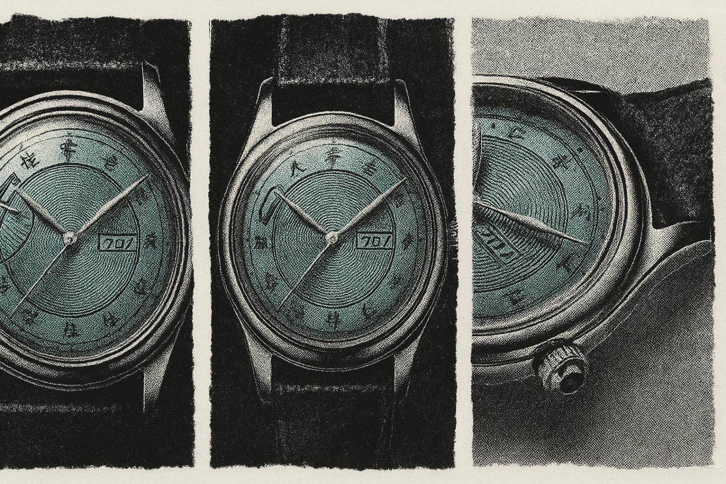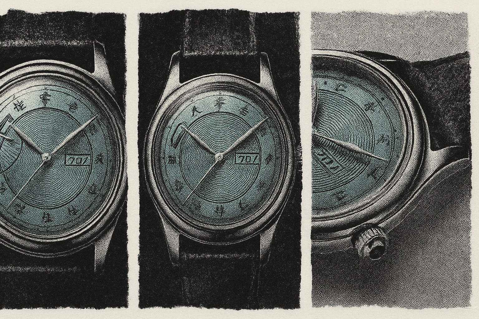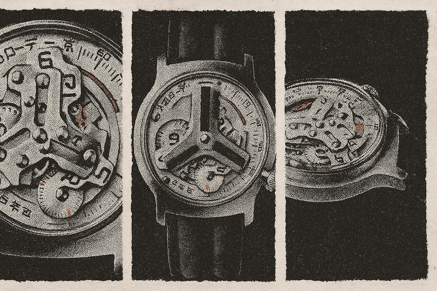 “Japanese independent solves jacket-cuff problem by pushing hours and minutes to the right. Satellite hour disk with double reduction gear against backlash. Ball bearing roller at eight, seconds at five keep moving. Components cast shadows through sapphire for depth. Mechanism borrowed from night clocks, repurposed for sleeve warfare.”