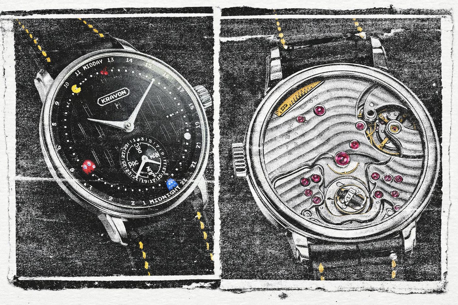 432 components that calculate sunrise anywhere on Earth—then let a yellow dot eat it. Onyx dial, hand-painted ghosts, maze visible only at the right angle. Ghosts turn blue at midnight. The Anywhere calibre dressed as 1980.