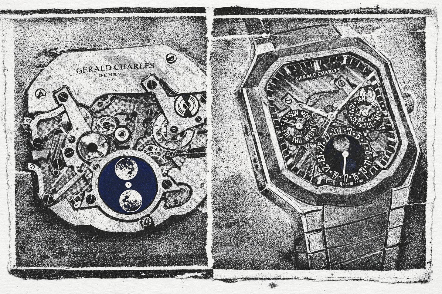 No hands. No logo. Just two arcs cut into an octagonal face—sun and moon drifting across apertures so slowly you forget you are reading time. Peseux 7001 halved to 24 hours. 6.3mm thin. Every series sells out in a day.