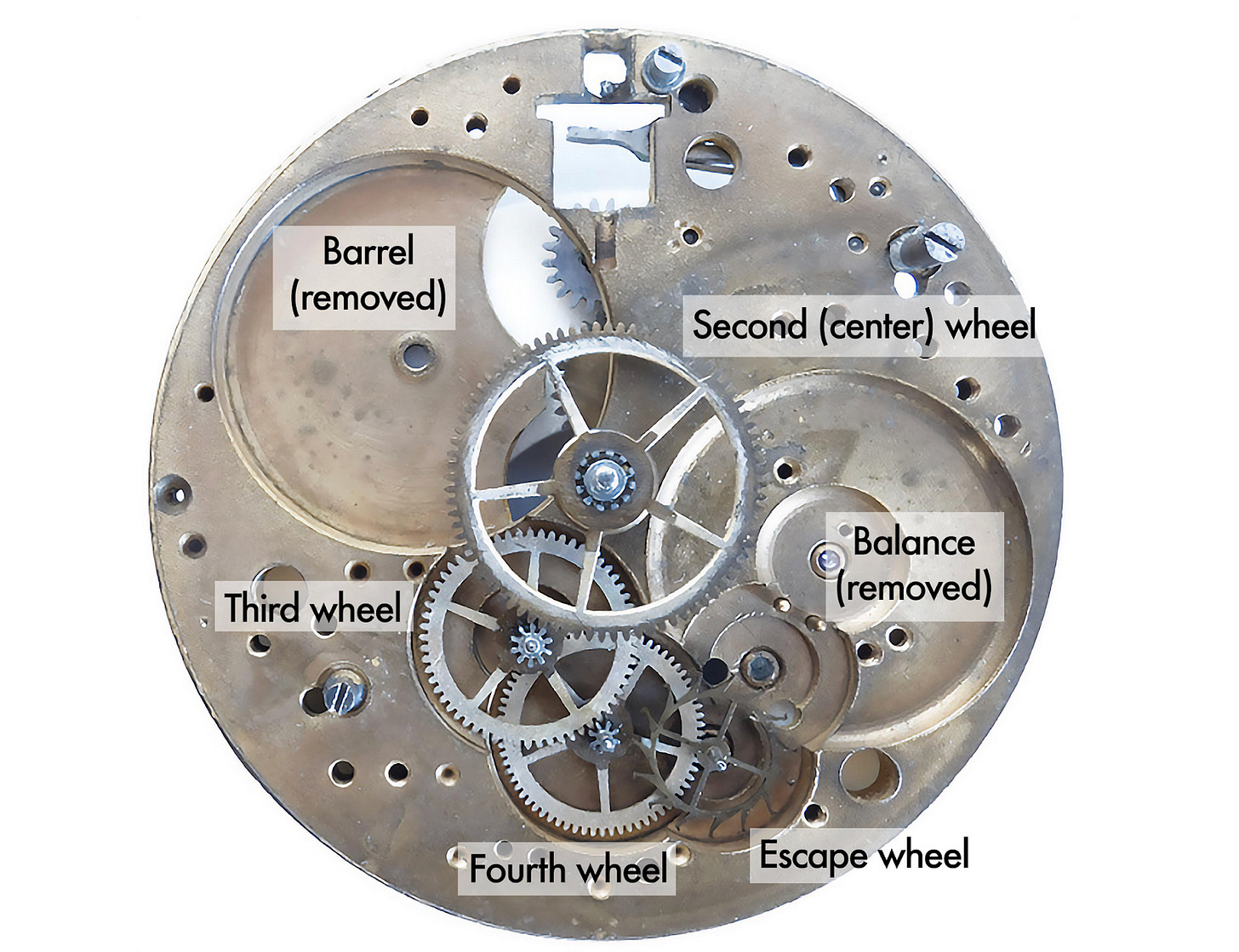 Before the 20th century, pocket watches were the dominant portable timekeeping devices that commonly featured small-second sub-dials. The mechanical limitations and movement structures of the time dictated this design. Early watch movements were constructed with a central axle dedicated to the hour and minute hands, while the fourth wheel, responsible for the seconds indication, was positioned off-center. This configuration allowed the gear train—consisting of the barrel, center wheel, third wheel, and fourth wheel—to transmit energy efficiently from the mainspring to the escapement and time-indicating hands. Each wheel reduced rotational speed to create precise divisions for hours, minutes, and seconds, and the fourth wheel directly drove the seconds hand.