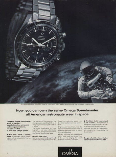 Several other watches have been in space since 1961 such as Bretiling, Rolex, Paneari, and Bulova but only one made it to the Moon. The Omega Speedmaster landed 6 times on the moon. And even after the last moon landing in 1972, Omega continued to market the Speedmaster as the Moonwatch and to invest on retaining the watch’s iconic status. (see Fig. 3).