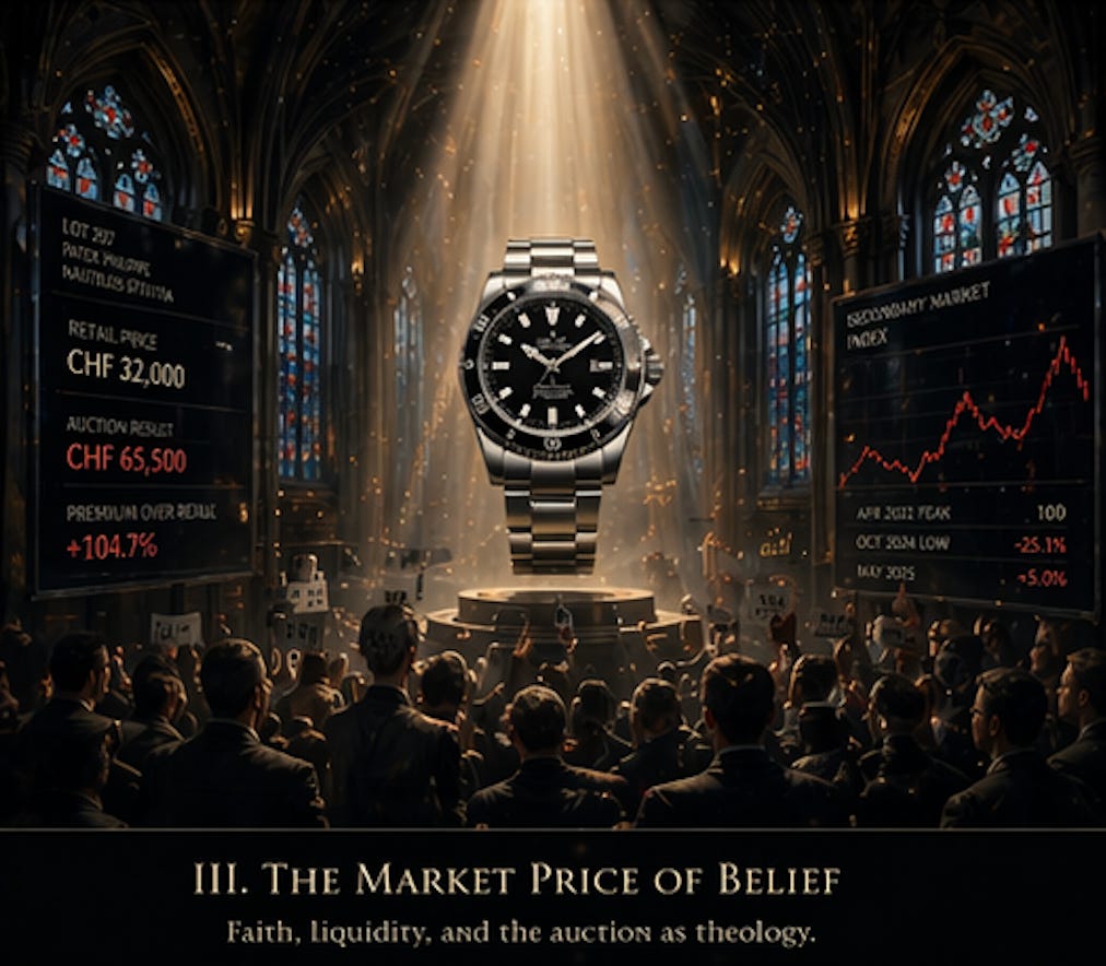This is the point at which Tissot’s 2000 framework proves both prescient and inadequate. He was right that brand value is a function of demand stability. He was right that demand stability can be measured, analysed, and discounted to present value. What he could not have foreseen is that the secondary market would become the arena in which these propositions are tested daily, with real money, by participants who have no obligation to be polite about the results. The secondary market does not care about Geneva Seals, hand-engraved rotors, or two hundred and sixty years of continuous operation. It cares about consensus — about the shared conviction that a particular object will hold or increase in value over time. This conviction is not irrational. But it is not a measure of quality. It is a measure of belief.