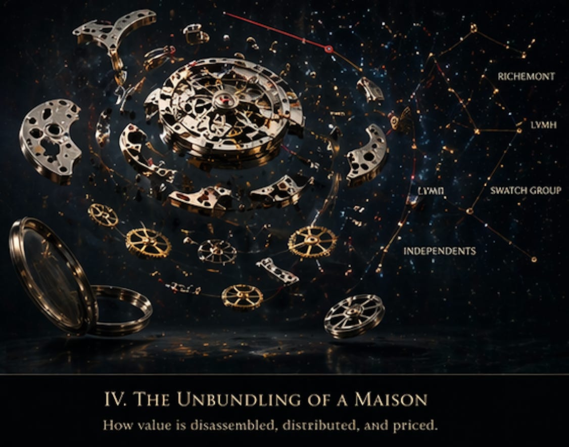 This is the inversion of Pierre Tissot’s 2000 thesis. He argued that brands are capital assets whose value derives from the stability of demand they generate. The implication was that aggregating brands into portfolios would compound that stability — diversification of demand, economies of distribution, shared infrastructure. For most of the past quarter-century, the industry behaved as if this logic were self-evident. The acquisition era assumed that more brands meant more value. Baume & Mercier’s departure suggests the opposite can also be true: a brand inside the wrong portfolio may lose value precisely because the group’s strategic priorities work against it. The conglomerate model does not just aggregate value. It can also quietly destroy it.