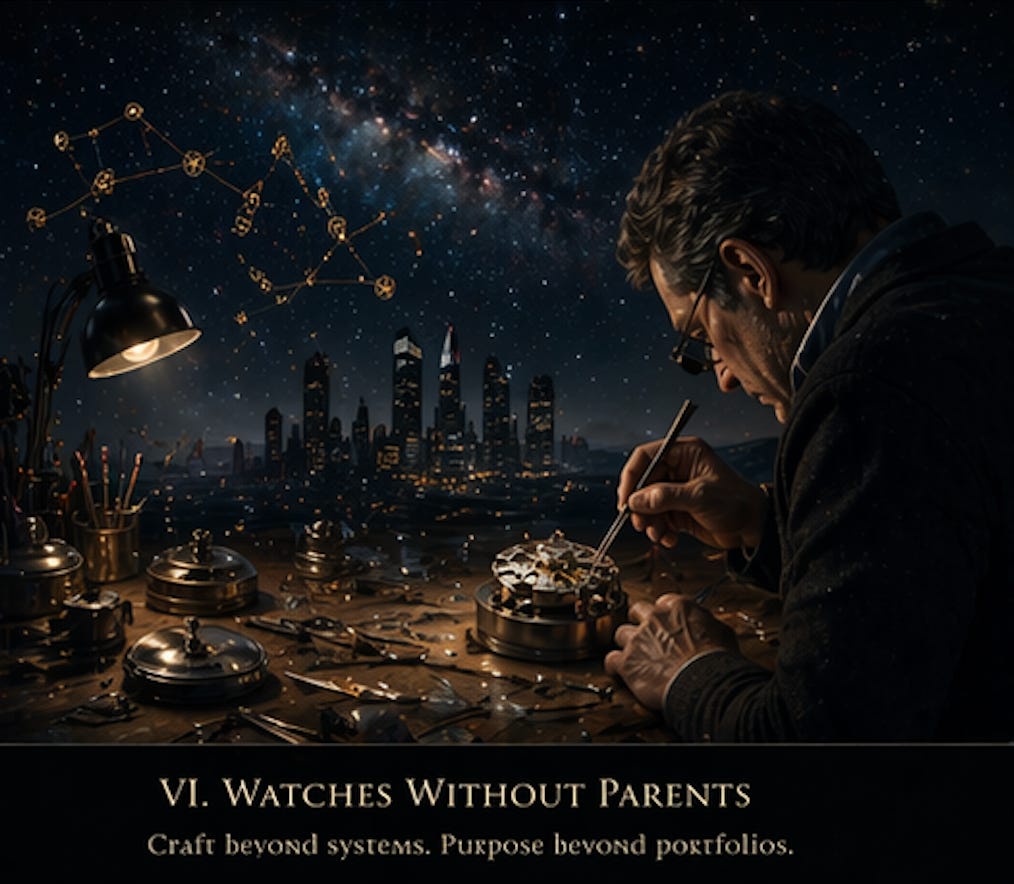 The preceding five essays in this issue have traced the logic of brands as financial assets — from Tissot’s original framework, through the consolidation era’s narrative engineering, to the secondary market’s stress-testing of belief, and into the current mutations of portfolio strategy at Richemont and Breitling. Each essay has operated within the same gravitational field: the assumption that brands exist, ultimately, as instruments of capital. This final essay asks what happens at the edge of that field. What survives outside portfolio logic? What does watchmaking look like when no one owns the story?