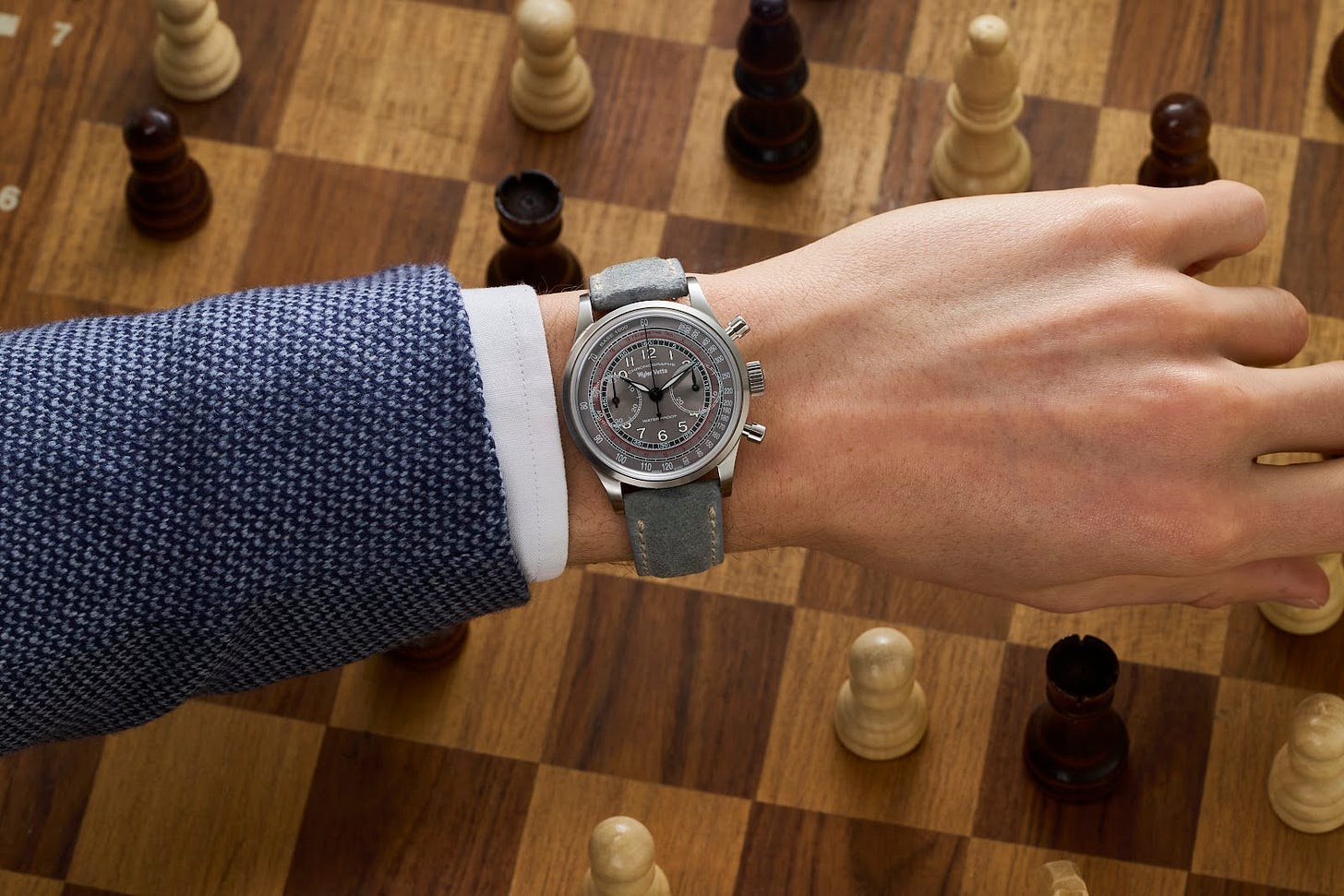 On the wrist, the design immediately brings to mind other popular vintage interpretations from brands like Furlan Marri, Lebois & Co, and Junghans---a testament to both the enduring appeal of this aesthetic language and the crowded nature of the neo-vintage chronograph space. Yet the Chronographe 38mm holds its own through careful attention to harmony. The color coding across dial elements creates visual coherence, while the proportions of registers, numerals, and scales feel precisely calibrated. The 38mm case size strikes an elegant balance suitable for most wrists, with a lightness that belies its substantial presence.
